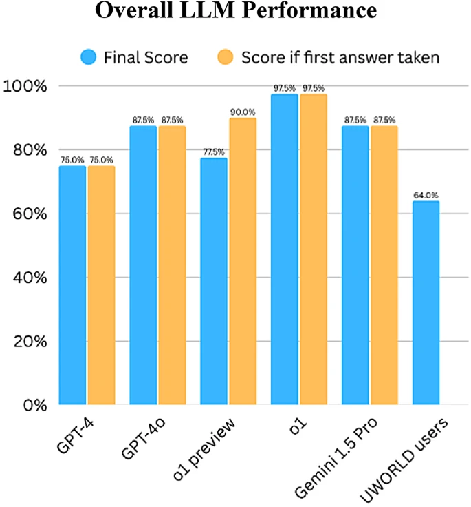 Ah, sí. En una sola categoría, práctica basada en sistemas y mejora de la calidad, la puntuación media de los usuarios humanos de U-World, 72,75%, superó a uno de los LLM.