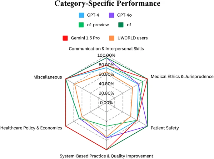 Algo así. GPT-4o destacó en lo interpersonal: sacó un 94,74% en comunicación y habilidades interpersonales, y un sobresaliente 100% en preguntas de seguridad del paciente.