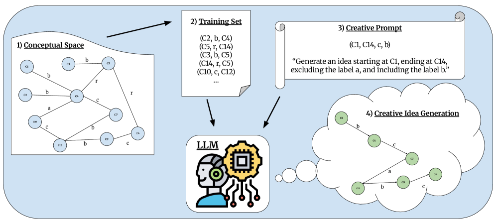 Entonces el modelo no está generando texto libre; está haciendo una tarea muy estructurada. El reto es generar un artefacto creativo, que se define literalmente como un camino en ese grafo. Básicamente le dices al LLM: aquí está el concepto A y aquí el concepto Z, encuentra un camino viable entre ellos.