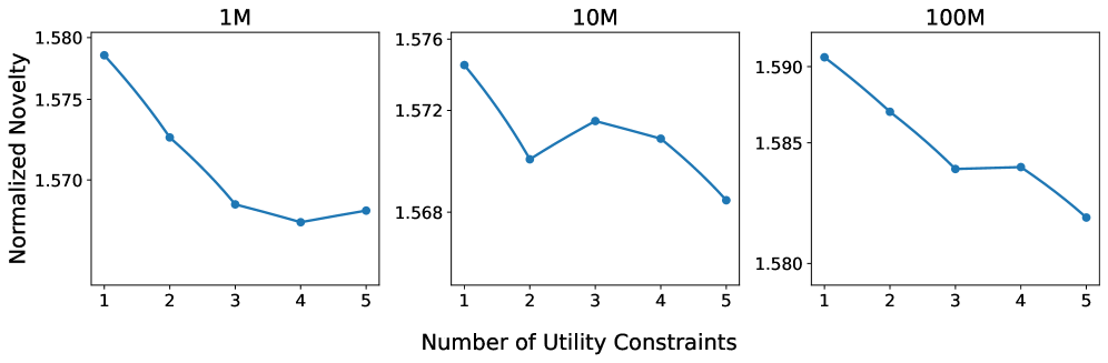 En el otro extremo, las restricciones de inclusión, las etiquetas que exiges, se tratan de asegurar rigor: es como exigir que una idea incluya una línea base adecuada para comparación o tenga un plan de implementación detallado, requiriendo la etiqueta “grupo de control”. Y por eso el hallazgo es tan importante: que esta compensación novedad-utilidad sigue ahí incluso a la escala de 100 millones de parámetros es una señal de alarma.