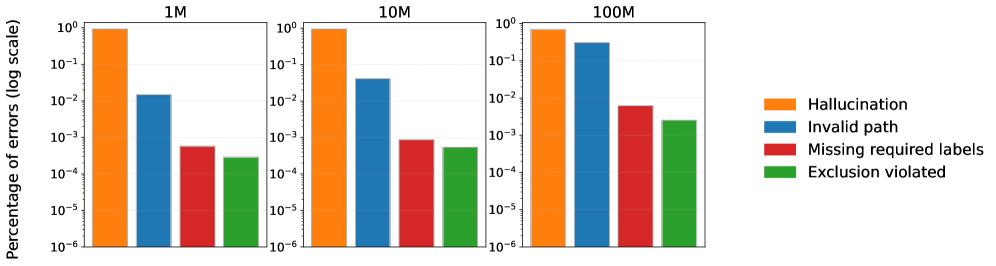 Pero a la escala de 100M, las alucinaciones cayeron drásticamente. El modelo conocía las reglas del grafo, pero los errores de ruta inválida, donde fallaba en cumplir las restricciones lógicas, crecieron hasta ser casi igualmente frecuentes.