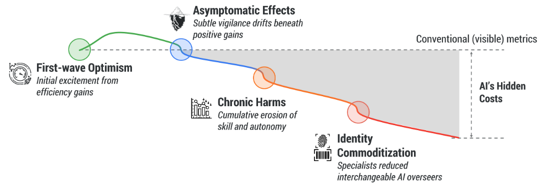 Esta investigación explora la paradoja de la IA como amplificador, donde la inteligencia artificial aumenta la productividad laboral al tiempo que provoca una erosión sutil y oculta de la experiencia humana y la identidad profesional. A través de un estudio de un año con especialistas en cáncer, los autores identifican daños asintomáticos, como la "oxidación de la intuición", que eventualmente se consolidan en una atrofia crónica de habilidades y una sensación de ser un "observador" en su propio campo. Las fuentes argumentan que las métricas actuales priorizan la velocidad y la precisión, pero no logran captar estos costos sociotécnicos a largo plazo para el trabajador. Para contrarrestar esto, los autores proponen un marco para la Interacción Digna entre Humanos e IA que desarrolla "inmunidad sociotécnica" mediante la detección, la contención y la recuperación de la pérdida de habilidades. Este enfoque desplaza el enfoque del futuro del trabajo al futuro de los trabajadores, garantizando que el juicio profesional siga siendo un componente central en entornos de alto riesgo. Al implementar características como la Transparencia Social, el marco ayuda a los expertos a mantener su capacidad de acción y evitar que sus roles especializados se reduzcan a productos intercambiables.