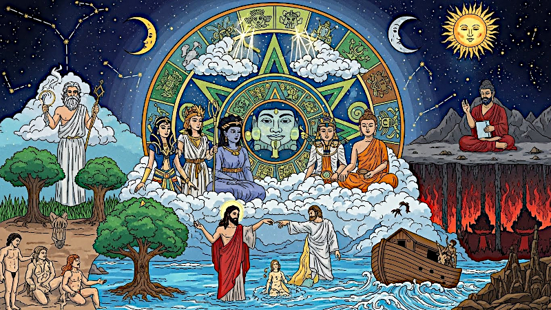 La mitología comparada es el estudio académico de temas y narrativas recurrentes presentes en diversas culturas del mundo. Los académicos de este campo examinan motivos universales, como la creación del mundo a partir de un huevo cósmico, los diluvios globales y la adquisición del fuego, para identificar experiencias humanas compartidas u orígenes ancestrales comunes. Los investigadores utilizan diversos marcos, como el análisis lingüístico, el estructuralismo y el psicoanálisis, para categorizar estas historias en patrones como el viaje del héroe o la lucha entre el orden y el caos. Si bien los primeros expertos buscaban construir una única "protomitología", los enfoques modernos a menudo equilibran estas amplias similitudes con las distinciones culturales únicas de sociedades específicas. En definitiva, la disciplina explora cómo las figuras legendarias y los símbolos sagrados reflejan los valores sociales, las observaciones científicas y las preocupaciones espirituales de la humanidad a lo largo de la historia.