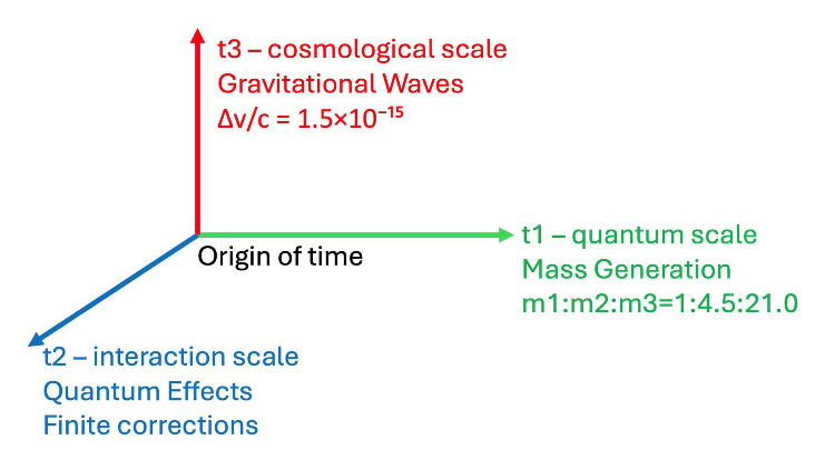 Esta investigación introduce un marco teórico que amplía la estructura del universo para incluir tres dimensiones del tiempo, cada una correspondiente a una escala física específica. Estos ejes temporales distintos rigen los fenómenos a escala cuántica, las interacciones de partículas y la evolución cosmológica, explicando de forma natural la existencia de tres generaciones de partículas y sus jerarquías de masa. Al tratar el tiempo como el tejido fundamental de la realidad, la teoría ofrece soluciones elegantes a problemas complejos como la violación de la paridad y la gravedad cuántica sin requerir dimensiones espaciales adicionales. La validez del modelo se sustenta en su capacidad para replicar las masas de partículas subatómicas conocidas con extrema precisión, a la vez que predice nuevas resonancias a escala de terahercios. Además, anticipa señales mensurables en las velocidades de las ondas gravitacionales y el comportamiento de la energía oscura que podrán comprobarse en futuros observatorios. En definitiva, el marco unifica la mecánica cuántica y la relatividad general al considerar la masa y la energía como manifestaciones de la curvatura temporal.