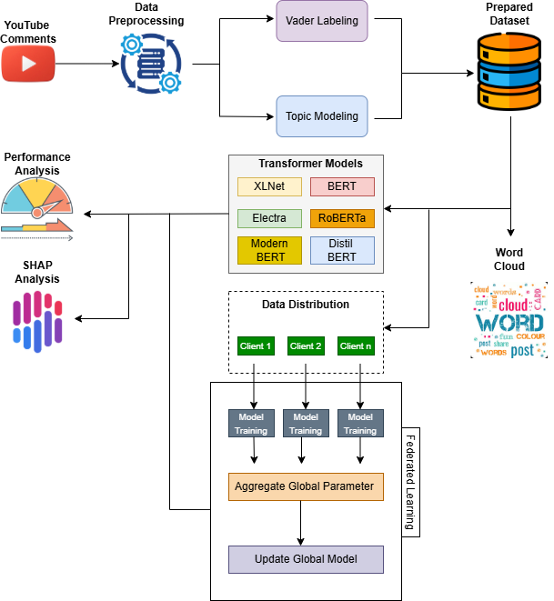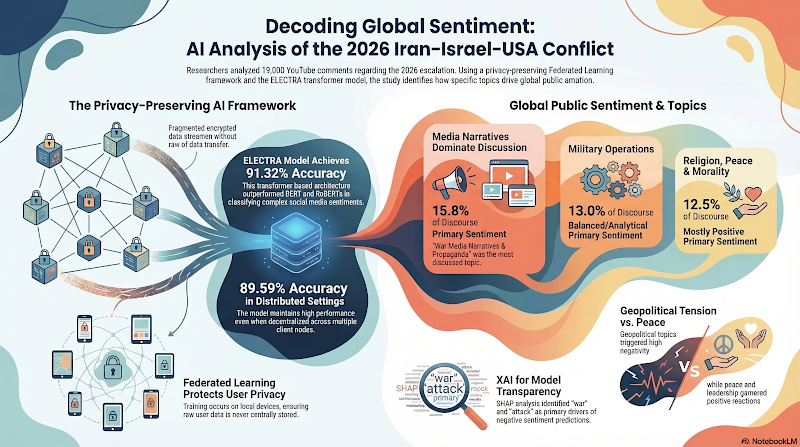 Esta investigación presenta un marco que preserva la privacidad para analizar el sentimiento público global respecto al conflicto Irán-Israel-EE. UU. de 2026, utilizando comentarios de noticias de YouTube. Los autores emplean la Asignación Latente de Dirichlet (LDA) para categorizar las discusiones en diez temas, como estrategia militar y propaganda mediática, y utilizan VADER para el etiquetado inicial de sentimientos. Tras probar varios modelos Transformer, el estudio identifica a ELECTRA como la arquitectura más eficaz, logrando una precisión del 91,32 % en la clasificación de las emociones públicas. Para garantizar la seguridad de los datos de los usuarios, el modelo se integra en un entorno de aprendizaje federado, que permite el entrenamiento descentralizado sin exponer información personal. Además, el marco incorpora IA Explicable (SHAP) para aclarar cómo las palabras clave específicas influyen en las predicciones positivas o negativas del modelo. En definitiva, los resultados revelan que, si bien las tensiones geopolíticas generan un sentimiento negativo, las discusiones sobre paz y liderazgo provocan reacciones globales más favorables.