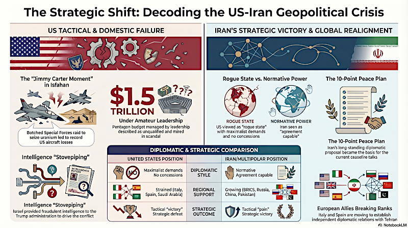 Este análisis examina el declive estratégico percibido de Estados Unidos y su alianza con Israel tras una serie de maniobras militares y diplomáticas fallidas en Irán. La fuente argumenta que una incursión fallida de las fuerzas especiales y las subsiguientes amenazas "civilizatorias" de la administración Trump han supuesto una humillación significativa para el poder estadounidense. A nivel interno, el análisis destaca el nombramiento de funcionarios no cualificados y las inminentes investigaciones políticas como señales de decadencia institucional. A nivel internacional, sugiere que Irán ha salido victorioso, lo que ha llevado a aliados europeos clave como Italia y España a romper filas con Washington. La narrativa concluye que Estados Unidos es visto cada vez más como un Estado paria, que sacrifica su influencia global para apoyar los intereses israelíes mientras potencias multipolares como China y Rusia ganan terreno.