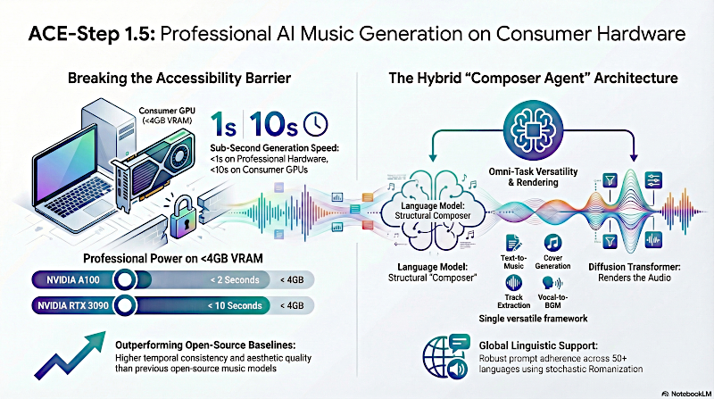 Este texto presenta ACE-Step v1.5, un modelo de base musical de código abierto diseñado para generar audio de calidad profesional en hardware de consumo. Desarrollado en colaboración entre ACE Studio y StepFun, el modelo utiliza una arquitectura híbrida que separa la planificación estructural de alto nivel mediante un Modelo de Lenguaje de la representación acústica detallada mediante un Transformador de Difusión. Este marco admite diversas tareas creativas, como la síntesis de texto a música, la extracción de pistas y la conversión de voz a música de fondo, manteniendo una alta fidelidad y eficiencia. Mediante la implementación de destilación adversaria avanzada, el sistema alcanza velocidades de generación inferiores a un segundo y se ejecuta localmente con requisitos mínimos de memoria. Los autores también detallan un proceso de anotación basado en aprendizaje por refuerzo y una rigurosa lista de verificación de usabilidad para garantizar que el modelo cumpla con los estándares de producción profesional en más de 50 idiomas. En definitiva, el proyecto busca democratizar la producción musical profesional al proporcionar una alternativa accesible y de alto rendimiento a las herramientas propietarias de código cerrado.
