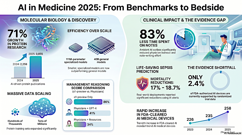 El informe del Índice de IA 2026 destaca un cambio fundamental en la inteligencia artificial médica, que pasa de la investigación teórica a herramientas clínicas prácticas y de alto impacto. En biología molecular, los modelos compactos y especializados superan actualmente a los sistemas más grandes en la predicción de la estructura de proteínas y el descubrimiento de fármacos. En los entornos clínicos se observa un aumento en el uso de dispositivos autorizados por la FDA, aunque la mayor parte de la adopción administrativa se centra en asistentes de IA que reducen significativamente el agotamiento profesional. Si bien los grandes modelos de lenguaje demuestran ahora un razonamiento diagnóstico superior al de los médicos humanos en escenarios de prueba, aún existe una brecha sustancial en la evidencia del mundo real. Además, el informe señala que la participación del paciente está cada vez más influenciada por los resúmenes de salud automatizados en los resultados de búsqueda, lo que plantea nuevas preguntas sobre la supervisión y la ética. En última instancia, la expansión exitosa de estas tecnologías depende del desarrollo de marcos de gobernanza sólidos y de garantizar la equidad sanitaria global.