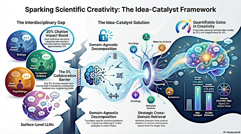 Este texto presenta Idea-Catalyst, un novedoso marco diseñado para potenciar la creatividad científica mediante el uso de Modelos de Lenguaje a Gran Escala (LLM) para la investigación interdisciplinaria. A diferencia de las herramientas de IA existentes, que se centran en la automatización de experimentos, este sistema prioriza el razonamiento metacognitivo para ayudar a los investigadores a superar las barreras académicas. El marco funciona descomponiendo objetivos de investigación complejos en desafíos independientes del dominio, lo que le permite recuperar y recontextualizar conocimientos de campos distantes como la psicología o la sociología. Este enfoque estructurado ayuda a evitar la fijación prematura en soluciones específicas, al tiempo que fomenta la síntesis de diversos fragmentos conceptuales. Los resultados empíricos demuestran que Idea-Catalyst mejora significativamente la originalidad y la profundidad de las ideas de investigación generadas en comparación con los métodos de recuperación estándar. En definitiva, las fuentes destacan cómo la exploración estructurada basada en IA puede tender puentes entre disciplinas aisladas para impulsar innovaciones científicas revolucionarias.