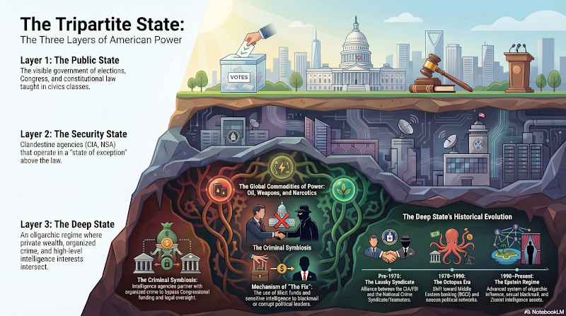 El texto incluye una entrevista con el Dr. Aaron Good, autor de American Exception: Empire and the Deep State, quien cuestiona la visión tradicional de Estados Unidos como una simple democracia liberal. Propone un modelo de gobierno tripartito compuesto por el Estado público, el Estado de seguridad nacional y un "Estado profundo" que opera mediante el poder extralegal y oligárquico. Este marco sugiere que, desde la Segunda Guerra Mundial, Estados Unidos ha funcionado como un imperio criminalizado que mantiene el dominio capitalista global a través de operaciones clandestinas y alianzas con el crimen organizado. El análisis destaca eventos históricos como el asesinato de JFK y el narcotráfico como evidencia de una relación simbiótica entre las agencias de inteligencia y los sindicatos ilícitos. Además, la fuente explora cómo los intereses sionistas y la influencia neoconservadora han moldeado la política exterior estadounidense, a menudo mediante chantaje político y financiación encubierta. En última instancia, Good argumenta que esta ilegalidad institucionalizada es una característica inherente del régimen estadounidense moderno, y no una serie de fallos accidentales.