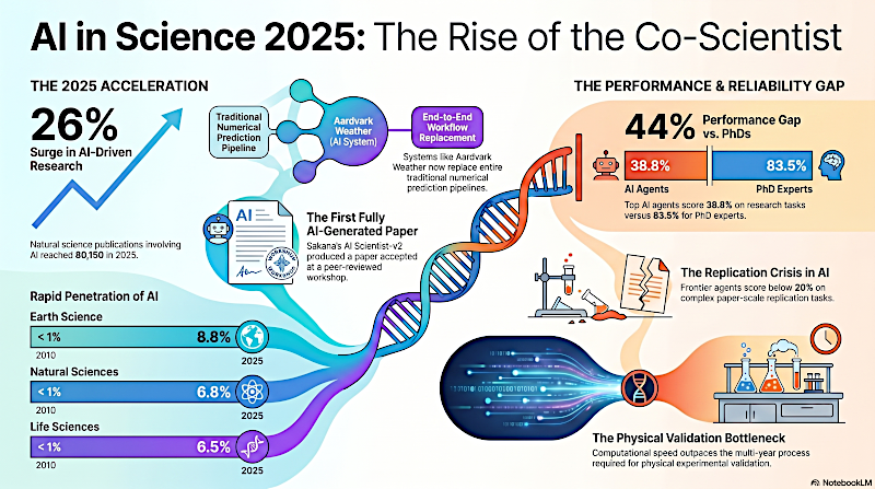 El texto presentado describe la rápida integración de la inteligencia artificial en diversos campos científicos, destacando 2025 como un año clave para los flujos de trabajo de investigación autónomos. Si bien la IA tradicionalmente ha ayudado en el análisis de datos, ahora está evolucionando hacia sistemas multiagente capaces de generar hipótesis, diseñar experimentos e incluso producir artículos revisados por pares. Se observan avances significativos en biología estructural, predicción meteorológica y ciencia de los materiales, impulsados por nuevos conjuntos de datos masivos y modelos fundamentales especializados. A pesar de estos avances, evaluaciones rigurosas revelan una brecha persistente entre los resultados generados por la IA y la fiabilidad de los expertos humanos, particularmente en la replicación de investigaciones complejas. Además, el informe subraya que la validación experimental sigue siendo un obstáculo crítico, ya que la capacidad de la IA para proponer descubrimientos supera actualmente la capacidad de la comunidad científica para ponerlos a prueba. En definitiva, el panorama está cambiando hacia una infraestructura de IA colaborativa, impulsada principalmente por instituciones académicas y gubernamentales, en lugar de solo por la industria.