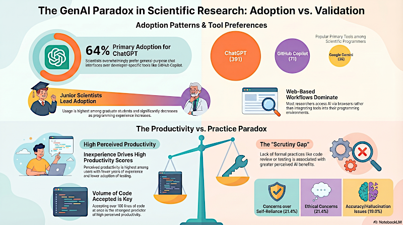 Este artículo de investigación examina cómo los científicos utilizan la IA generativa para facilitar las tareas de programación, analizando específicamente las tasas de adopción y la productividad percibida. Basado en una encuesta a 868 investigadores, el estudio revela que los científicos noveles y aquellos con menos experiencia en programación son los usuarios más frecuentes de estas herramientas. La mayoría de los participantes prefiere las interfaces conversacionales de propósito general, como ChatGPT, a los programas especializados para desarrolladores integrados en sus entornos de programación. Los datos sugieren un riesgo potencial de dependencia excesiva, ya que quienes no siguen prácticas de validación estándar —como las pruebas de código o la revisión por pares— reportaron la mayor sensación de productividad. La alta eficiencia percibida también se relacionó fuertemente con la aceptación de grandes bloques de código a la vez, lo que indica que los usuarios pueden valorar más el volumen de resultados que la verificación. En definitiva, los autores destacan la tensión existente entre el atractivo de la IA para ahorrar tiempo y la necesidad crítica de precisión en el software científico.
